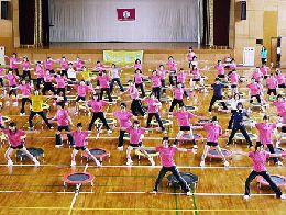 | トランポ・ロビックスについて説明をして頂きました。 古谷久代副会長・井上紀子会長 | 沢山のミニトランポリンでトランポロビックス 兵庫国体の開会式の練習です。皆さん真剣です。 | 直径86cm、高さ20cmのジョグ(ミニトランポリン) 音楽に合わせ、ジョグの上で行います |