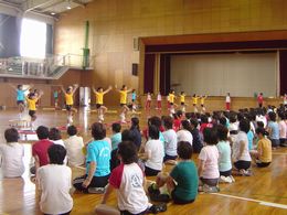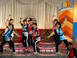 | 兵庫大学体育館でトランポ・ロビックスの練習風景を拝見。 皆さん元気一杯で兵庫国体の開会式・アトラクションのダンスを練習。(2006/7/16) | ||