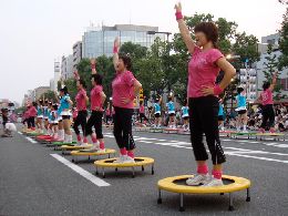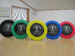 | トランポ・ロビックスとは トランポ・ロビックスはエアロビクス(有酸素運動)にトランポリンを取りいれた運動です。 直径86cmのミニトランポリンの上で行うエアロビクスエクササイズという意味を持っています。 歩く・走る・飛ぶ、体に優しいトレーニング方法です。 足腰への負担が少なく、短時間でできる効果的な運動です。 姫路菓子博で「スイーツダンス」 のじぎく兵庫国体で「はばタンダンス」 | ||